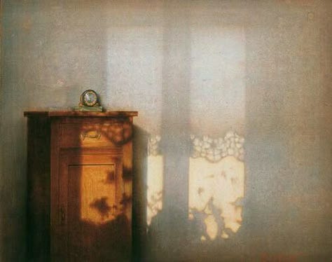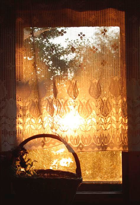 I notice how the morning sunlight filters through the café curtains in my kitchen.