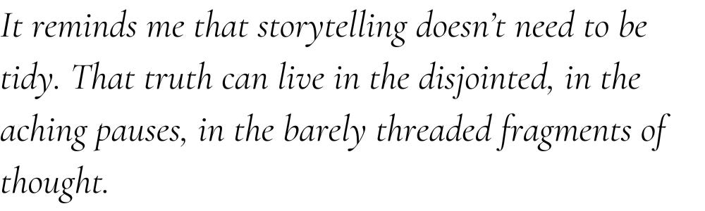 The structure is deliberately disorienting. Stream of consciousness spills into philosophical digressions, odd footpaths that seem to lead nowhere—until suddenly they do. I often wondered if the point of view had shifted, or if I’d lost the thread entirely, only to realize I was exactly where she intended me to be.